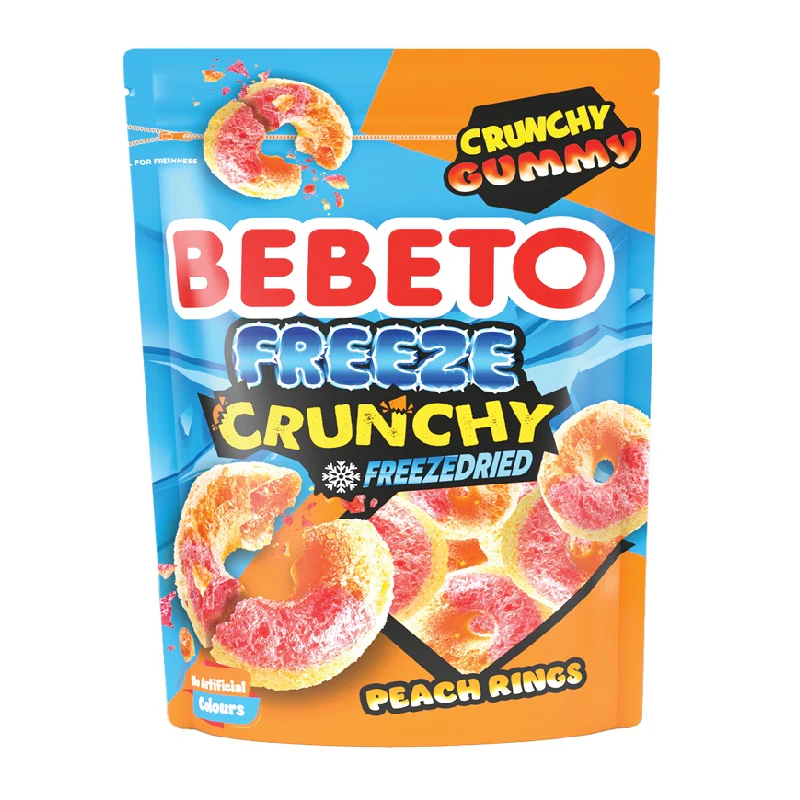 Sirop de glucose, sucre, jus de pomme concentré, amidon de maïs, gélatine de bœuf, régulateur d'acidité (acide citrique), acides (acide tartrique, acide malique), arôme, jus de fruits et de légumes concentrés (pomme, radis, cassis, carotte noire), poudre de fruits (pêche), colorants (extrait de paprika, lutéine, radis, cassis, carotte noire).