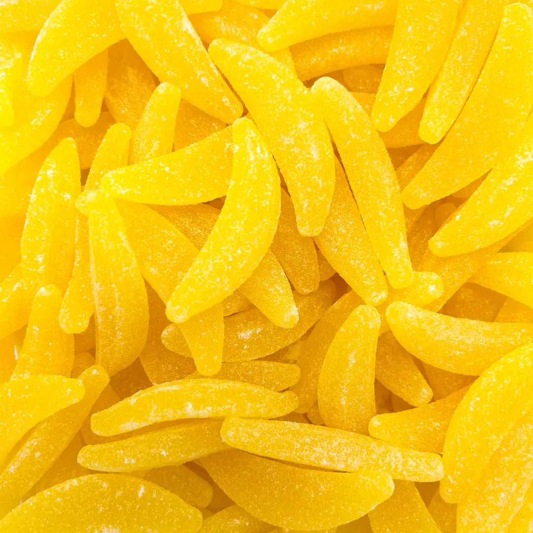 Sirop de glucose, sucre, eau, amidon modifié de pomme de terre, 5% de jus de fruits à base de concentré (pomme, raisin, poire, ananas, pêche). acidulans : E330, E296, E270. arômes, colorants : E133, E171.