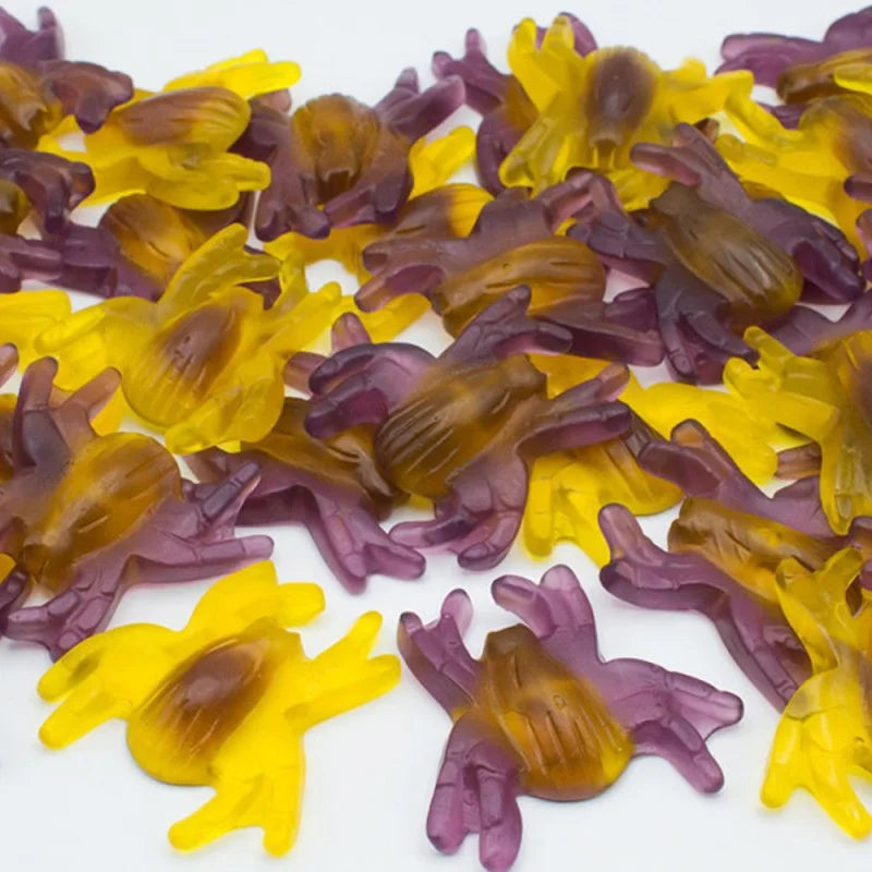 sirop de glucose, sucre, eau, amidon modifié de pomme de terre, gélatine bovine halal, acidifiants (E330, E296, E270), arômes, colorants (E102, E122, E131), huile végétale (palme), agent d'enrobage (cire de carnauba).