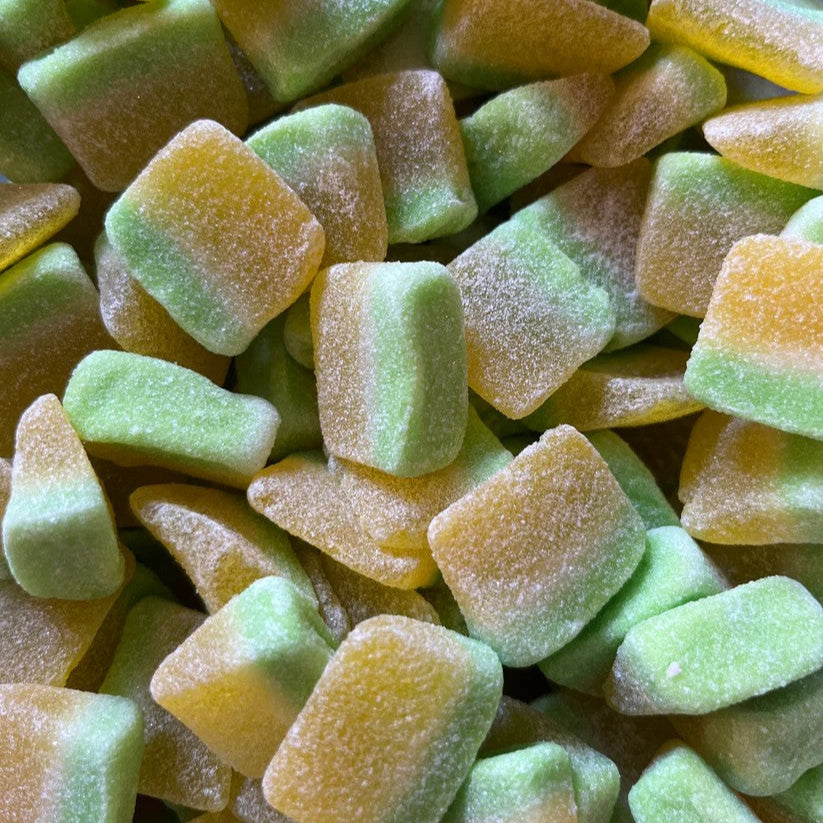 Sirop de glucose-sucre, eau, amidon modifié de pomme de terre-gélatine, acidifiants E330, E296, E270, arôme, colorant E102, E133 ,E516, huile végétale, agent démoulage : cire de carnauba.